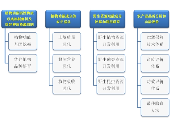 功能农业作为农业未来发展的新阶段,支撑着农业的生态高值目标,也开启了“吃”的新时代,高产农业解决了人们“吃得饱”的问题,绿色农业解决了人们“吃得安全”的问题,而功能农业主要是希望解决人们“吃得健康”的问题。功能农业工程研究中心瞄准未来大健康、农业科技前沿及吉林省农业供给侧结构性改革的现实需求,从植物功能性成分的资源挖掘,功能性成分的育种强化、农艺强化技术入手,结合产品的品质分析和功能性评价的研究,为进一步提升我省农业发展质量,推进乡村绿色发展,为实现新时代农业的“弯道超车”提供技术储备和理论支撑。本研究中心主任为吴刚教授。研究重点主要侧重于以下几方面:1)植物功能活性物质形成机制解析及优异种质资源创制。2)植物功能成分的农艺强化。3)野生资源功能成分挖掘和利用研究。4)农产品品质分析和功能评价研究。具体主要发展方向及任务如下: