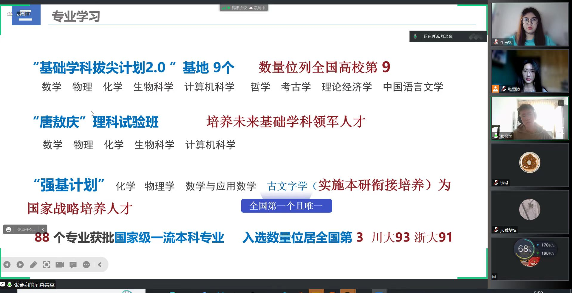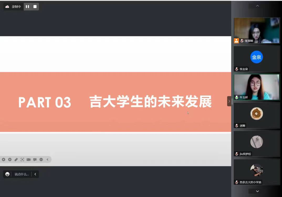 宣讲活动以线上腾讯会议的方式展开。线上宣讲活动开展之前通过转发宣讲海报等方式吸引母校的学弟学妹积极按时参加宣讲活动。把吉林大学的风采留在母校,让更多学弟学妹了解吉林大学。在社会实践中开阔了视野,锻炼了沟通与表达能力,激发了感恩情怀,进一步明确了青年大学生的成才之路与历史使命。