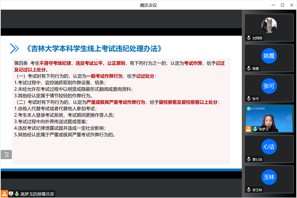 会议围绕《吉林大学本科学生违纪处分规定》《吉林大学本科学生线上考试违纪处理办法》以及寒假期间社会实践、期末复习、疫情防控三个方面展开。各年级辅导员就《吉林大学本科学生违纪处分规定》中关于考试违纪部分条例进行解读。针对即将到来的部分线上期末考试科目,详细解读《吉林大学本科学生线上考试违纪处理办法》,让全体学生对线上考试纪律有了较为清晰的认识。会上,各年级辅导员强调,大学生要提高对考风考纪的思想认识,考风考纪关系到学生的道德素养和规矩意识,关系到社会的公平正义。优良的考风不仅有助于形成良好的考试习惯,正确发挥考试的价值,更是有助于形成公平公正的竞争环境,优良的考风需要全体同学共同去营造、维护。考试纪律是对考试行为的规范和约束,是对考试违规行为的惩处依据,大学生要对考试纪律心存敬畏之心,要把考试纪律作为底线,坚决不能触碰。要求同学之间要相互监督提醒,要把问题扼杀在摇篮里,要敢于向违规违纪行为说不,树立正确的荣誉观,对待考试要放平心态,坚决杜绝通过非正常途径提高成绩、参与评奖评优。