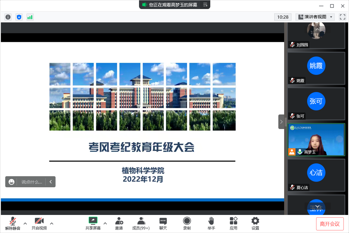 为进一步加强学风、考风教育,严格考试管理,严肃考试纪律,营造文明、诚信考试的良好氛围,提高学生的道德修养和思想素质,12月20日—22日,植物科学学院各年级召开考风考纪教育大会。会议由2019级、2020级辅导员曾光,2021级、2022级辅导员高梦玉主持,各年级全体本科生线上参会。