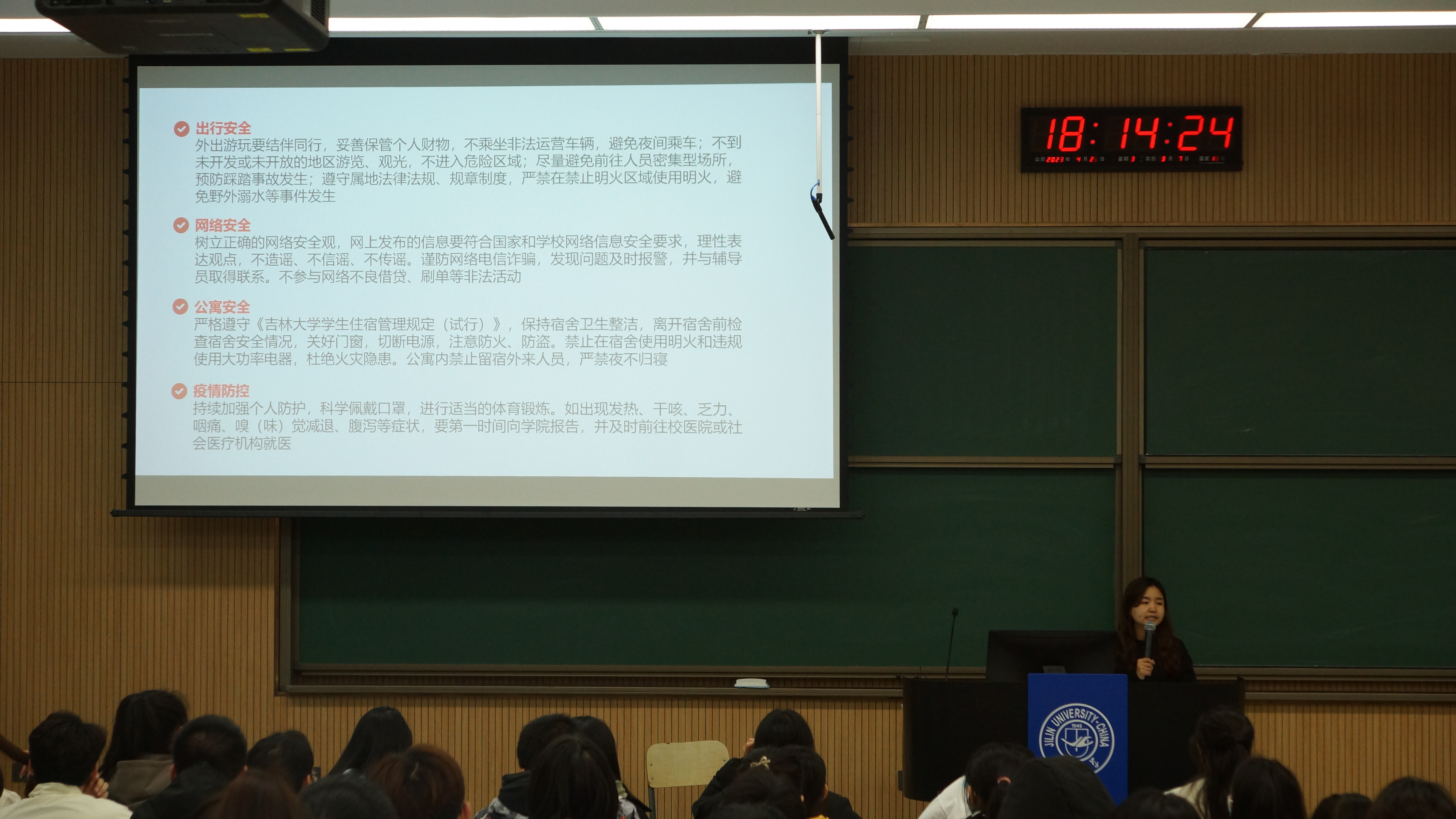 会上,高梦玉详细解读了学校《关于做好劳动节期间本科生管理工作的通知》内容,针对假期期间可能存在的各类安全问题,结合真实案例要求学生在出行安全、网络安全、公寓安全、个人防护等方面增强安全意识,做好防范,同时要求全体学生提前如实、详尽地登记个人假期去向。高梦玉提醒全体学生尽量避免到人群密集的场所,注意乘车和交通安全;离校和返校途中,要尽量结伴同行;外出旅游或走访同学、朋友,要及时知会家长;严防各类诈骗,防溺水,不要参加非法聚会;留校学生应严格遵守学校的各项规章制度和宿舍管理规定。