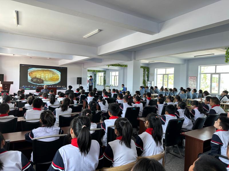 植物科学学院2021级植物保护专业本科生李若愚以中国农耕文化——蚕桑文化为主题向在场的同学们科普中华农耕文明知识。在实践团成员一个个启发式的提问中,孩子们争相回答,一步步了解蚕桑知识和历史文化,逐渐进入并开始探秘丝绸世界。从丝绸之路到一带一路,从华夏文明到锦绣中华,丝绸的发展无不体现着科技的进步和人类的智慧。实践团成员通过播放视频等方式带领孩子们学习抽丝剥茧、编程织造的过程。孩子们不仅感受到了劳动人民的智慧,也领略到了我国丝绸科技与文化的魅力。讲座结束后,实践团向哈达门乡中心学校赠送图书、设立图书角,赠送植物科学学院师生制作的昆虫标本及我校文创产品。活动受到了当地学校师生的一致好评和欢迎。