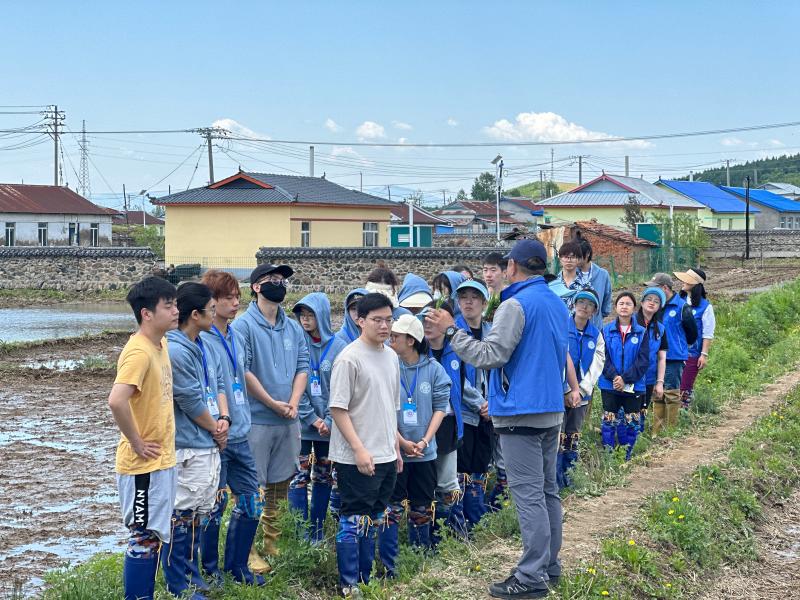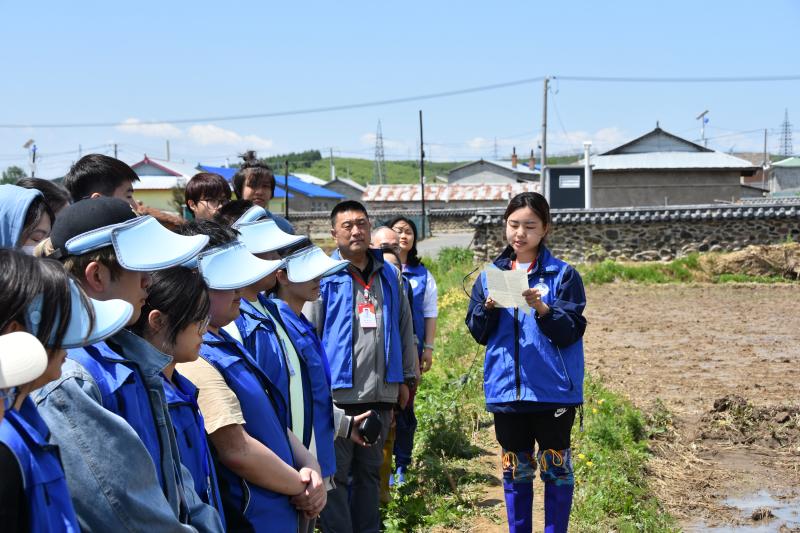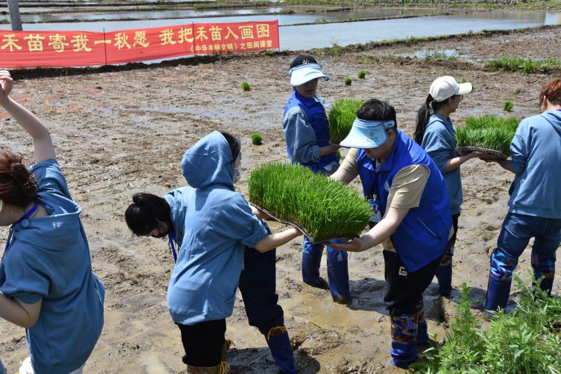 植物科学学院副院长韩俊友及几位专任教师向实践团师生详细讲解了水稻插秧的注意事项并亲身示范,带头在品种实验区插下垄垄青苗。随后,实践团成员纷纷下田,师生一同换上插秧靴,挽起衣袖,在哈达门乡的稻田间接过秧苗,种下由吉林大学植物科学院自主研发的水稻品种——“吉大6”,共同播种下新的希望。在分苗、俯身插秧间,师生种植了水稻,也延续着袁隆平院士的稻田梦想。