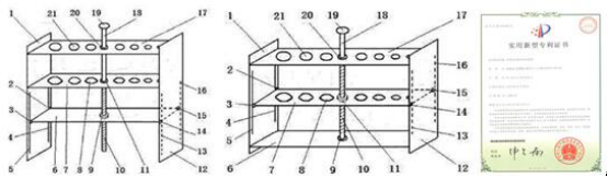 本成果为一种底座升降式层析柱固定装置+降式层析柱固定装置,底座板两端经四个滑轮与左右侧板上的四个滑槽滑动连接中、上孔径板中心分别与两个轴承的外圈固接,中、上孔径板上所设椭圆形孔和圆形孔均为一个,中孔径板上的椭圆形孔与上孔径板上的圆形孔,每对椭圆形孔和圆形孔的中心在一条垂直线上上孔径板、中孔径板两端分别与左侧板、右侧板的上、中部固接螺杆顶端固接手动调节轮,螺杆上、中部分别与两个轴承内圈固接,螺杆下部与固接于底座板中心的螺母螺纹连接本实用新型结构简单、易操作调节,接收瓶高度可随意改变,可解决层析柱固定后接收瓶高度不易改变的问