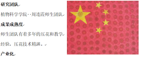 产业立足于园艺植物的观赏性,将天然植物与文化创新相结合,让更多人感受到植物科学与艺术结合的魅力。产品以自然界植物为原材料,通过采摘其根、茎、叶、花和果实等部位,用物理或化学等干燥法脱水处理,将植物本身具有的天然形态、自然色泽和奇妙纹理巧妙地保留起来,将压制好的平面花材,经设计构思粘贴在各种衬物上制成精美的艺术品。产业在花艺创作的基础上,以能长久保存花艺产品的观赏特性、纪念价值和意义以及压花教学带来的心理疗法作为产业发展思路。产业定位为文化创意产业中的手工艺品制造,做结合中国传统文化特色和时代精神的压花手工艺品,以及建立使顾客解压、舒缓心情等作用的压花休闲教学。本团队在第二届全国农科学子创新创业大赛“未来农业”奇思妙想创意赛道东北赛区三等奖、2020年吉林大学大学生生命科学创新创业大赛一等奖、2020年吉林大学大学生创新创业校赛互联网+赛道铜奖等。
