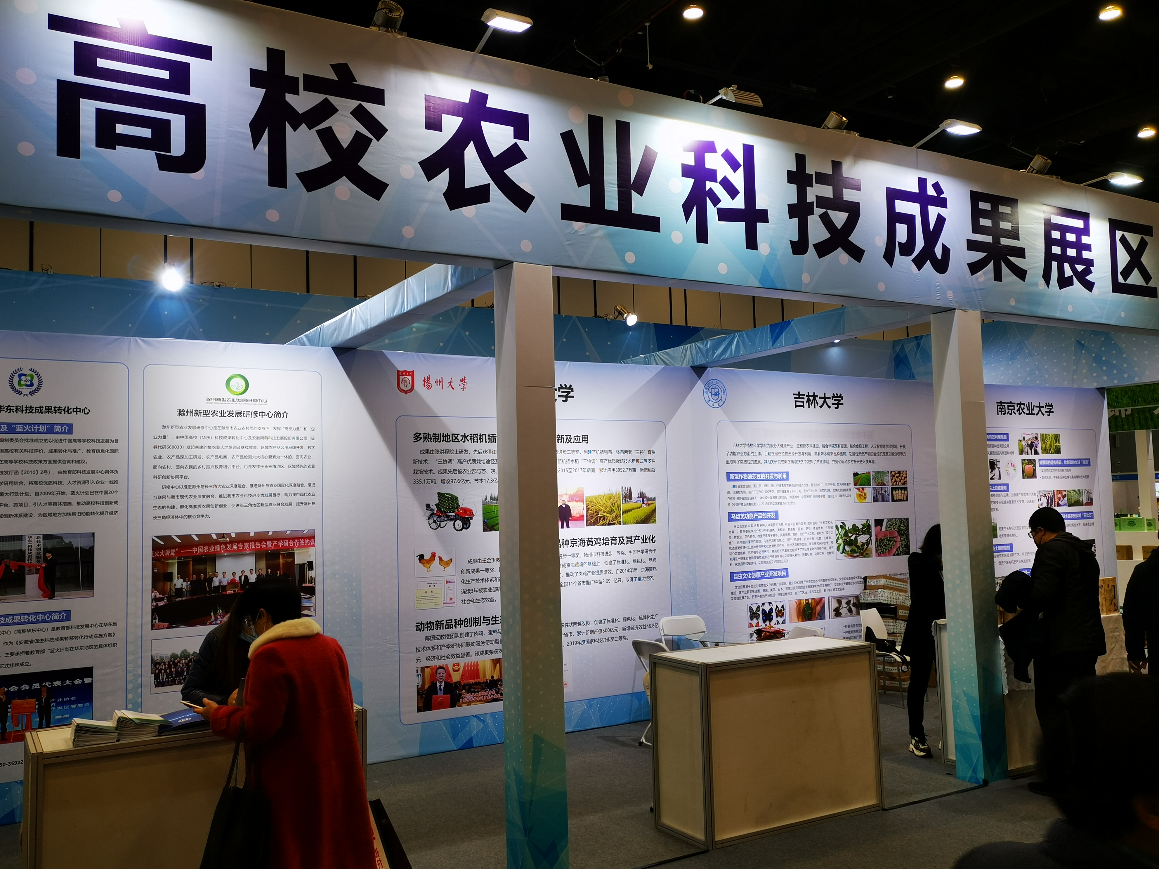 在高校农业科技成果展区,来自于南京农业大学、扬州大学、西北农林大学、东北农业大学、吉林大学等高校展示了科技成果及产品,我校展示了国审水稻、玉米品种、新型作物油莎豆开发与利用、马齿苋功能产品开发和藤茶功能产品的开发等科研成果及功能农产品项目,并集中展出了吉林大学功能农业基地(通榆)的扶贫产品。新华社记者采访了吉林大学植物学院副院长韩俊友教授和吉林通榆经济开发区党工委书记李开福。韩俊友教授介绍了一款由吉林大学功能农业团队研发的,30余种粮食(含药食同源植物)为主的。适用亚健康人群的天然、无添加的功能农产品。李开福书记介绍了通榆的自然环境条件、重点推介了来自家乡的优质功能农特产品,并表示在吉林大学的定点扶贫工作中,功能农业团队充分挖掘了通榆的自然资源和农业生产特点,仅仅围绕大健康人群的需求,提高了当地农产品的附加值,使农户们增收脱贫,受益良多,对吉林大学表示感谢。