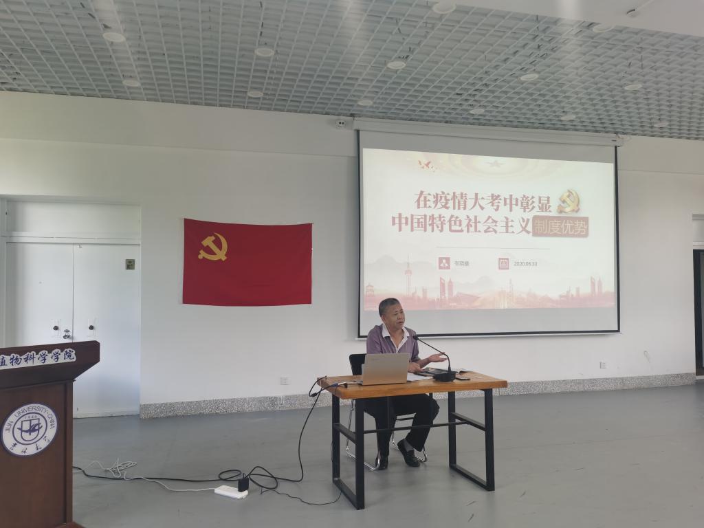 为庆祝建党99周年,按照《关于召开“七一”专题组织生活会和开展“党课开讲啦”活动的通知》要求,植物科学学院党委于6月30日在学院二楼报告厅组织开展了迎“七一”专题党课暨重温入党誓词活动。学院领导班子成员、党支部书记、系主任、在校研究生党员在线下参加活动,部分教师党员和本科生党员在线上一同参与。