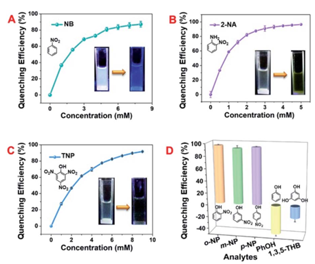 图2.DCP5-Eu1Tb3对硝基苯(NB),2-硝基苯胺(2-NA)及三硝基苯酚(TNP)的检测能力表征。(图片来源:J. Mater. Chem. A)