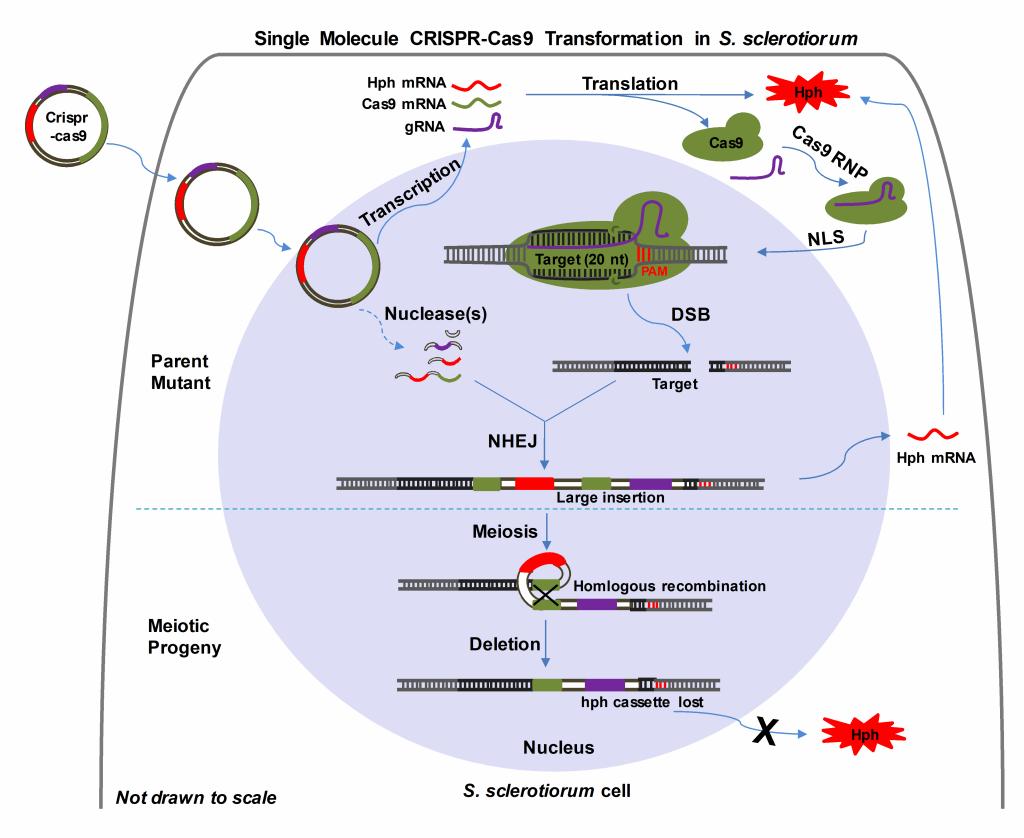 核盘菌(S.sclerotiorum)是引起作物菌核病的一种重要的植物病原真菌。其寄主范围极广,病害易流行。植物科学学院潘洪玉教授带领的“作物重大病害流行预警及其绿色综合防控关键技术研究”吉林省重大科技研发人才团队,多年来致力于核盘菌致病和发育分子机理的研究。然而,基于传统的基因突变技术(同源重组、基因沉默、T-DNA插入及UV诱变)存在效率低、不稳定等问题,制约了核盘菌致病基因功能的研究,因此,急需开发新的、高效、经济及简便的基因突变技术。CRISPR技术是在上个世纪九十年代初发现的并在近几年迅速成为人类生物学、农业和微生物学等领域最流行的基因编辑工具。该论文报道了核盘菌CRISPR-Cas9介导的基因编辑策略及该技术在核盘菌未知基因功能领域的应用。该研究发现将编码Cas9、靶标sgRNA和标记基因的质粒转化到核盘菌中后,可对靶标基因造成高频率的插入突变。研究发现核盘菌在Cas9蛋白造成靶基因双链断裂(DSB)后,并在非同源末端修复(NHEJ)机制下将降解的质粒片段随机组合并整合到DSB位点,造成大片段插入的靶基因突变。因此,筛选标记(HygB)的辅助下,即可以获得含HygB抗性的插入突变体。该研究还发现,随机整合的大片段在同源序列存在的情况下,经核盘菌有性生殖阶段会因同源重组而发生片段丢失,因此又可以在子囊孢子中筛选到HygB抗性丢失的子代突变体。该编辑体系模型在三个独立的核盘菌野生型上进行了验证,并实现了对草酸相关基因(SsOah1)及黑色素相关基因(SsPks13)进行了高效突变。该研究结果不仅进一步确定了草酸在核盘菌致病上的关键作用,还发现了其对菌核和侵染垫的数量也有重要影响;同时发现侵染垫的色素积累对核盘菌的侵染及致病性无显著影响。CRISPR-Cas9技术在核盘菌中的开发和运用将进一步推动核盘菌后基因组时代,也会加速核盘菌致病相关基因的挖掘与功能研究,对于快速鉴定核盘菌新的致病因子及最终实现病害防治具有重要意义。
