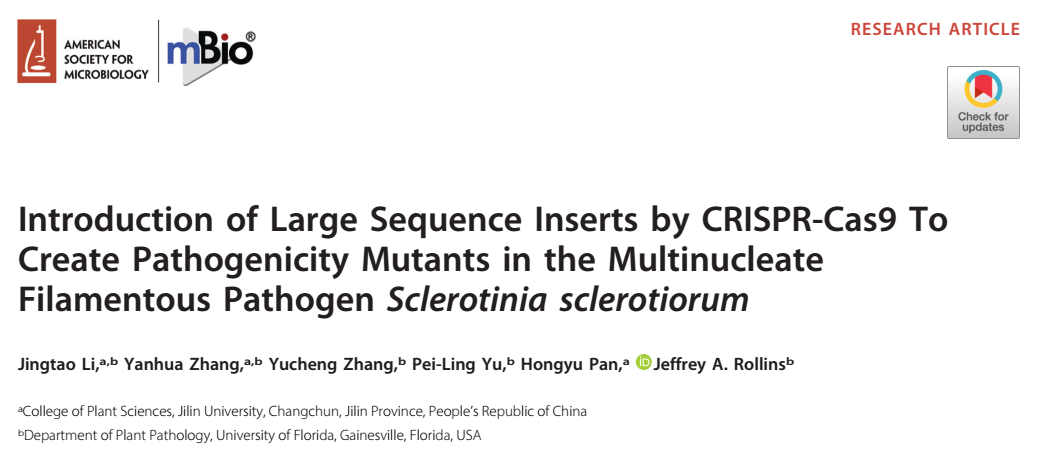 2018年6月26日,吉林大学植物科学学院潘洪玉教授领衔的创新团队与美国佛罗里达大学Prof. Jeffrey A. Rollins在美国微生物学会(American Society for Microbiology)旗舰下最重要学术刊物《mBio》(IF=6.956)在线发表了死体营养型植物病原真菌-核盘菌(Sclerotinia sclerotiorum)基因编辑领域的重要原创成果“Introduction of large sequence inserts by CRISPR-Cas9 creates pathogenicity mutants in the multinucleate filamentous pathogen Sclerotinia sclerotiorum”(doi:10.1128/mBio.00567-18)。该文章以吉林大学为第一完成单位,首次报道了核盘菌CRISPR-Cas9基因编辑机理并对草酸合成关键基因SsOah1、侵染垫形成与色素积累相关基因SsPks13进行编辑,阐明了其对核盘菌致病及生长发育的影响。核盘菌基因编辑技术对其他作物丝状病原真菌基因功能研究亦具有重要科学价值。该项研究由张艳华教授和李敬涛博士共同完成,吉林大学潘洪玉教授与佛罗里达大学Jeffrey A. Rollins为共同通讯作者。