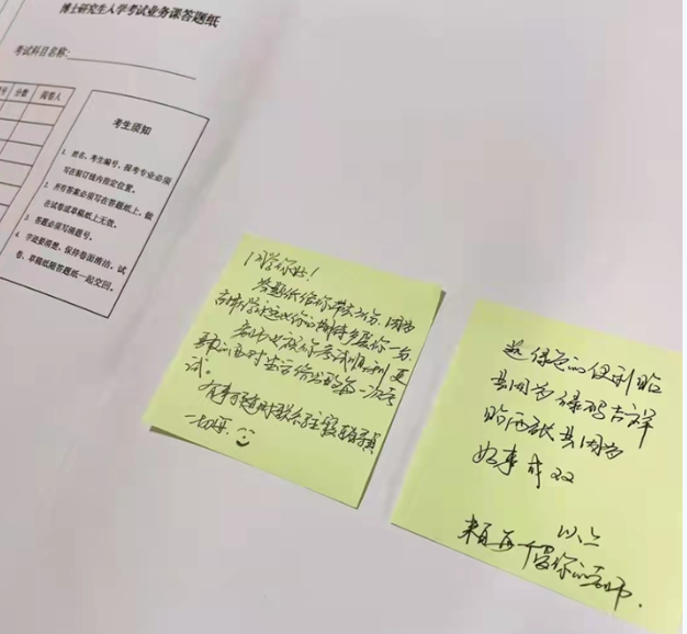 3月14日,8号公寓1名研究生获知其申请的博士考核单位将于3月16日-17日进行线上考核,复试要求自行准备B4双面答题卡2份,并在独立、封闭的空间完成。得知此事后,秦建春多次与学校、考生、复试考核单位等积极沟通,一方面联系校区学工办的老师们帮忙打印,另一方面与公寓管理部门协调安排空寝室为学生提供复试场地。3月15日上午,一切准备就绪,在送给该名学生的答题卡上,贴着两张绿色的便利贴,上面写着: