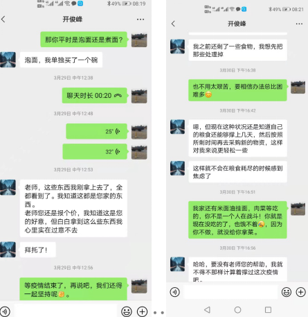 党支部书记王洪预在与包保学生的谈心谈话中了解到,1名同学单独在校外居住,受疫情管控影响,基本生活保障已出现较大问题。王洪预当即把家中仅有的火腿肠、方便面、挂面、水果、鸡蛋及自制的咸菜等以无接触方式送给学生,帮助解决燃眉之急。