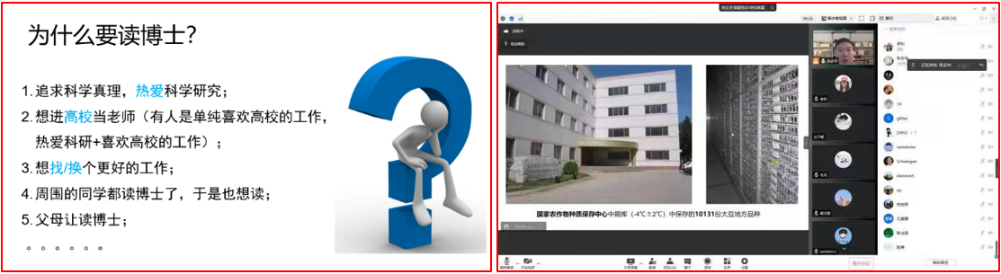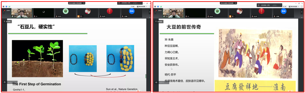 大豆是重要的粮油兼用作物,是人类优质蛋白的主要来源,关系国计民生的重要基础性、战略性物资,是最具经济效益的作物,在农产品贸易领域扮演着举足轻重的角色。4月8日晚7:00,王英教授围绕“源于华夏,繁盛千年——大豆的前世今生”这一主题,介绍了大豆生物学特性,分析了大豆经济产量低的原因,以及大豆生产面临的挑战和困境。也从进化角度、考古角度、文化传承角度、大豆向世界传播角度,证明大豆起源于中国,阐释了大豆从野生豆进化到栽培豆的重大事件和历史沿革,并解释了重要农艺性状驯化过程中,我们祖先对性状改良的原因及现今科研人员对于重要性状的遗传解析成果。通过大豆出土,适应环境,阐明大豆具有承受压力、积极适应,乐观向上的精神,以物喻人,以激励学生与疫情做斗争。通过古诗词、豆腐发明、豆油的食用,以及大豆在各历史阶段的重要性排序,解释了大豆在我国历史上的贡献。通过我国大豆与美国大豆单产、高产记录,分析我国大豆生产中存在的差距,查摆问题,提出解决方案。也通过我国建国以后大豆生产和科研所取得的成就,激励学生投身农业科研事业。