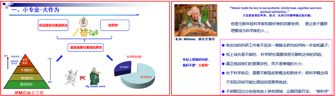 科学家,听上去是一个赋有崇高使命与威望的职业,但其本质仍然是指做科研的学者。如果选择了走科研这条道路,那就意味着面对各种挑战和艰辛。4月4日晚7:00,尚庆利教授围绕“科研道路上的思考与感悟”这一主题,针对自己的科研经历,从“小专业-大作为”介绍了农药在农业生产中的贡献,当今有害生物抗药性导致的农药发展所面对的机遇和挑战。结合实际,介绍了小专业既可以做“顶天”科学研究,也可以“立地”而贡献于实际生产。而对我们每个年轻科研工作者来言,无论工作的大小与高低,只有踏踏实实的工作成绩才能获得国内外同行的认可。年轻人在发展初期,开展研究切勿跟风而沦为别人眼中的“做科学”。科学研究的最终目的是共享,结合自己写作经验,从“勤写作-会交流” 角度如何把发现的问题,运用科学方式验证的,经过归纳推理整理出来的结论,用自己独特的听说读写能力,清晰准确的撰写出来,公开发表,并与同行交流分享。