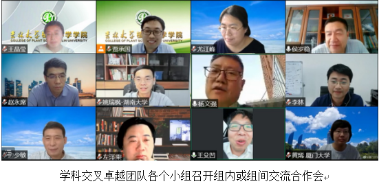 截止目前,共有45所高水平大学和科研院所的116位专家加入学科交叉卓越团队,其中有94位国家级优秀人才,包括国家杰出青年基金获得者35人,长江学者奖励计划获得者5人,国家“万人计划”领军人才5人,国家优秀青年基金获得者21人,国家“万人计划”青年拔尖人才11人,新世纪优秀人才培养计划获得者6人。现阶段,团队设有6个方向,分别是大健康、生物育种、黑土地保护、植物保护、园艺和未来科学,下设12个小组。团队负责人由植物科学学院党委书记于生宗担任。团队每周面向全国举办一次学术报告,邀请团队内具有影响力的专家做报告,目前已经组织开展了22期线上线下结合的学术报告,主会场均设在吉林大学植物科学学院,线上听报告人数最高峰达到腾讯会议上限,线下组织学院教师、研究生和本科生参加。报告的关注度迅速提升,多家媒体和领域公众号纷纷转发报告海报。另外,各个小组不定期开展学术交流活动。团队组建以来,通过学术报告、团队内专家交流、组内和组间学术交流等活动,促进了交叉融合,达成了一系列合作意向,同时团队和植物科学学院的影响力也得到了极大地提高。
