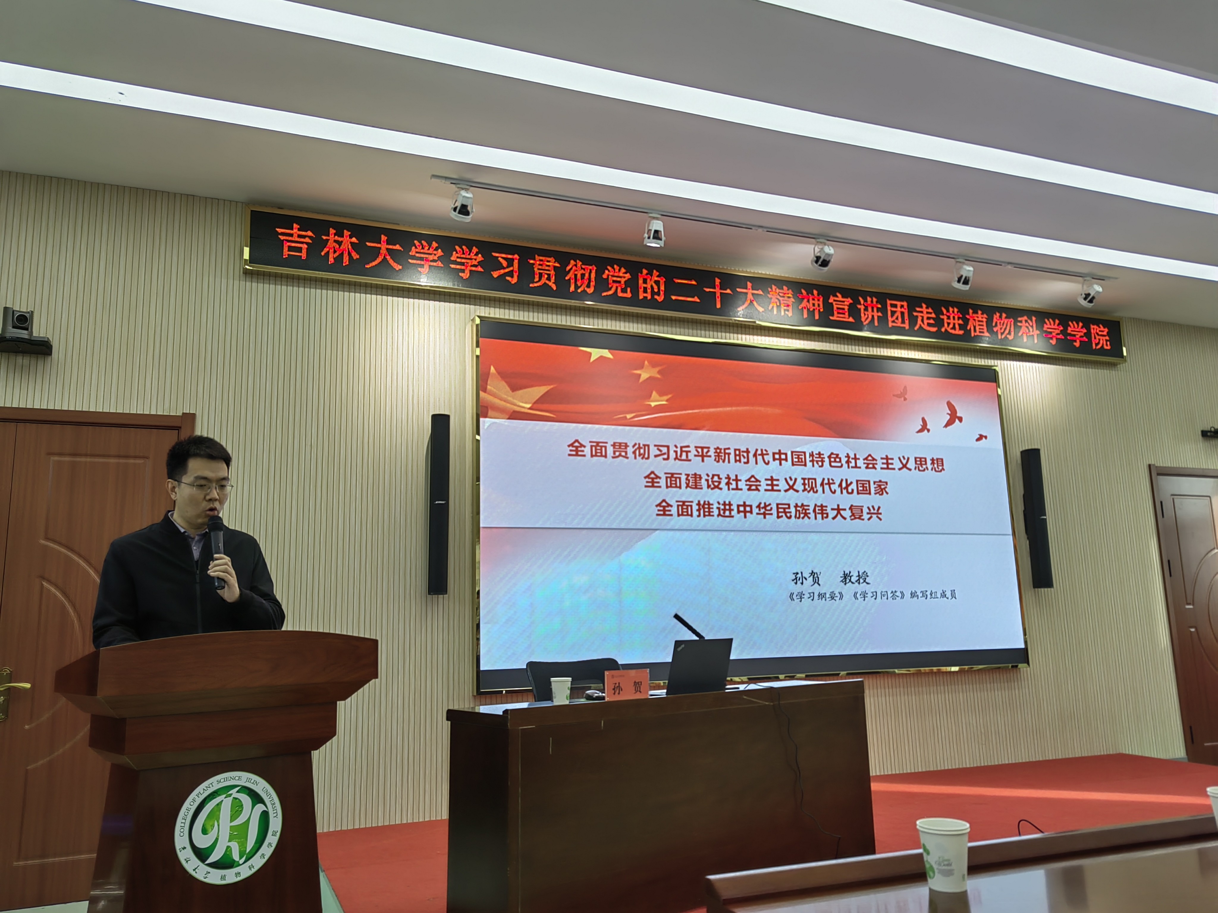 2022年11月9日下午,吉林大学学习贯彻党的二十大精神宣讲团走进植物科学学院进行宣讲,学院近百名师生共同学习党的二十大精神。走进植物科学学院的是宣讲团成员马克思主义学院教授、博士生导师、中央马克思主义理论研究和建设工程专家、吉林大学中国特色社会主义理论体系研究中心副主任孙贺老师。西区事务办公室主任刘效森、党委宣传部副部长张倩、植物科学学院领导班子成员参加宣讲活动,活动由学院党委副书记兼副院长潘振主持。