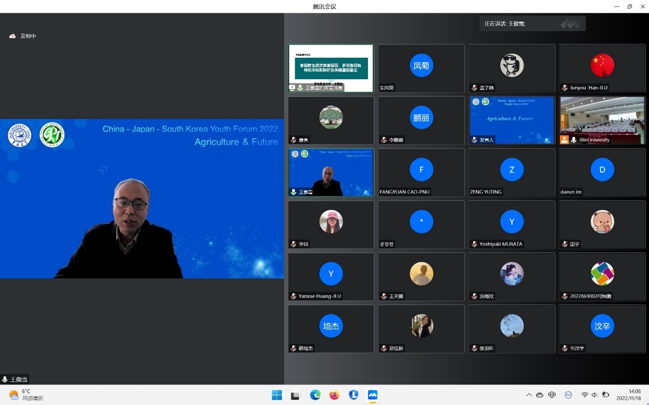11月18日,由吉林大学植物科学学院承办的2022年吉林大学“中日韩青年论坛”在吉林大学植物科学学院二楼多功能报告厅线上线下同步举行。本次论坛主题为“粮食与未来”,来自韩国世宗大学、日本国冈山大学、中国北京大学、东北农业大学、沈阳农业大学、吉林大学共6所国内外高校和研究机构的专家与青年学者、学生近200余人参与了此次论坛。