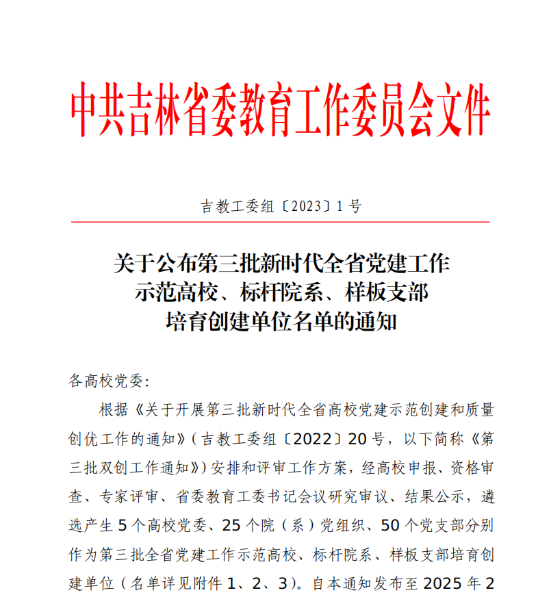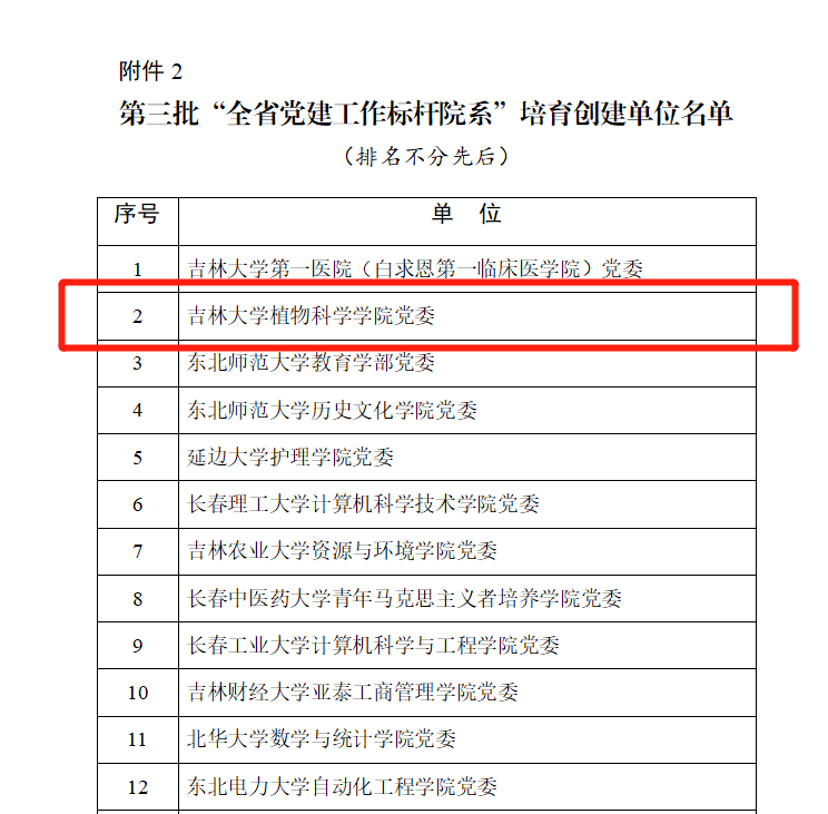 近日,吉林省委教育工委下发了《关于公布第三批新时代全省党建工作示范高校、标杆院系、样板支部培育创建单位名单的通知》,植物科学学院党委获批“全省党建工作标杆院系”培育创建单位。