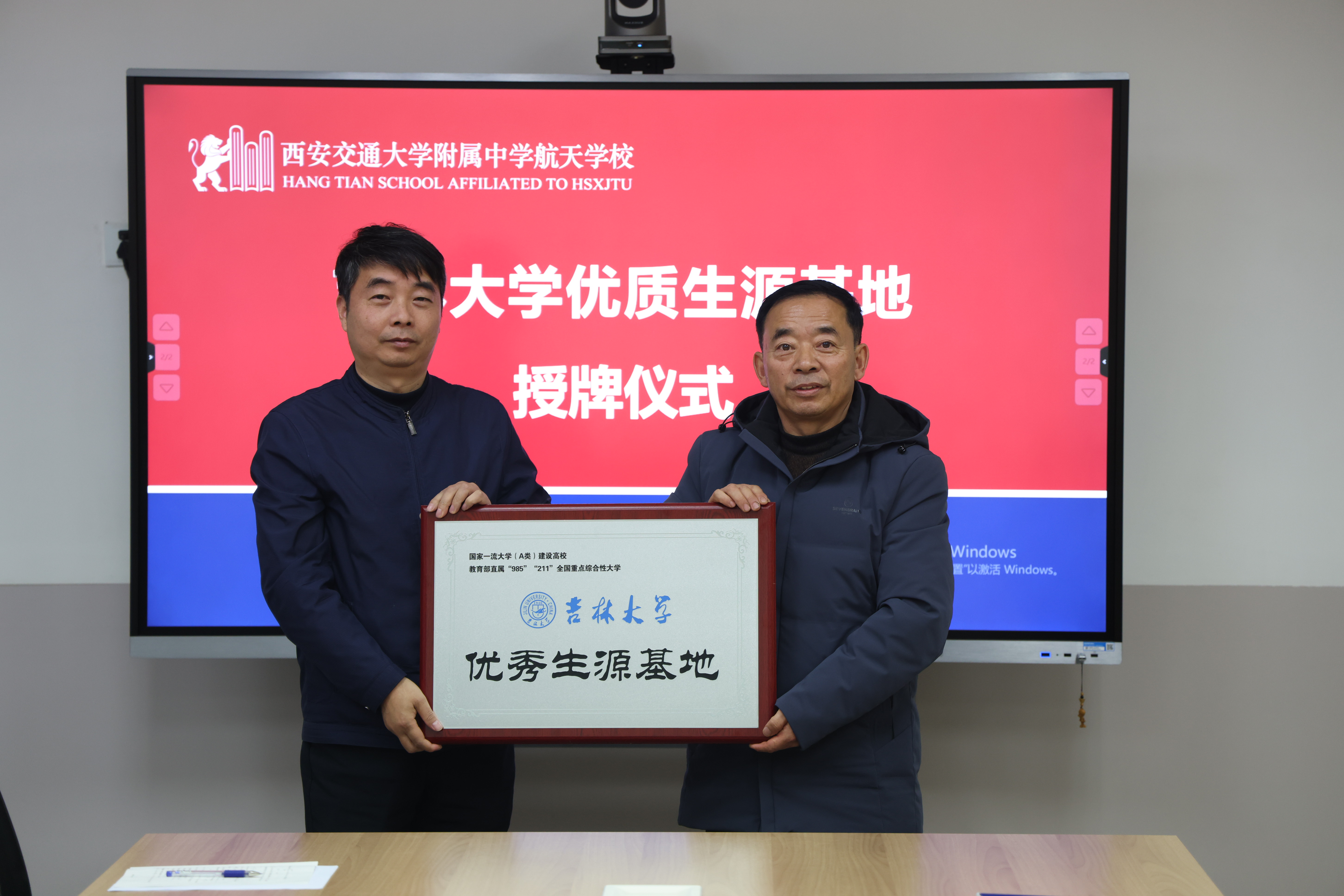 吉林大学本科招生办公室李莲英副主任、庞原鹏副主任、植物科学学院唐明祥老师一行前往西安市招生宣传。12月15日下午,李莲英副主任和庞原鹏副主任到临潼参加中国高等教育学会招生考试研究分会第二届常务理事会第二次会议暨招生考试创新研讨会,唐明祥老师到西安交通大学附属中学航天高级中学进行招生宣传。该中学始建于1898年,是一所由西安市教育局批准,西安交通大学附属中学全面管理的民办学校,一本录取率均在80%以上,近几年考入吉林大学的学生就有11人,而且该校的学生人数还在继续上升。由于正好赶上高一至高三都在考试,该中学组织相关人员在高中部四楼会议室召开座谈会及授牌仪式,座谈会上分管教学的王争争副校长对吉林大学的到访表示热烈欢迎和感谢,随后,他介绍了中学的概况,唐明祥老师给参会人员播放了吉林大学的招生宣传片,同时还简要介绍了吉林大学的由来、人才培养、招生政策等情况,与该中学的领导和老师进行了广泛友好的交流,并就下一步的招生宣传达成了共识,最后唐明祥老师为该中学授吉林大学优秀生源基地牌匾,王争争副校长接牌并合影留恋。参加座谈会的人员有西安交大附中航天高级中学副校长王争争、教务处主任张旭东、高三年级中心主任吕剑飞、宋宁以及高三班主任和吉林大学植物科学学院的唐明祥老师。