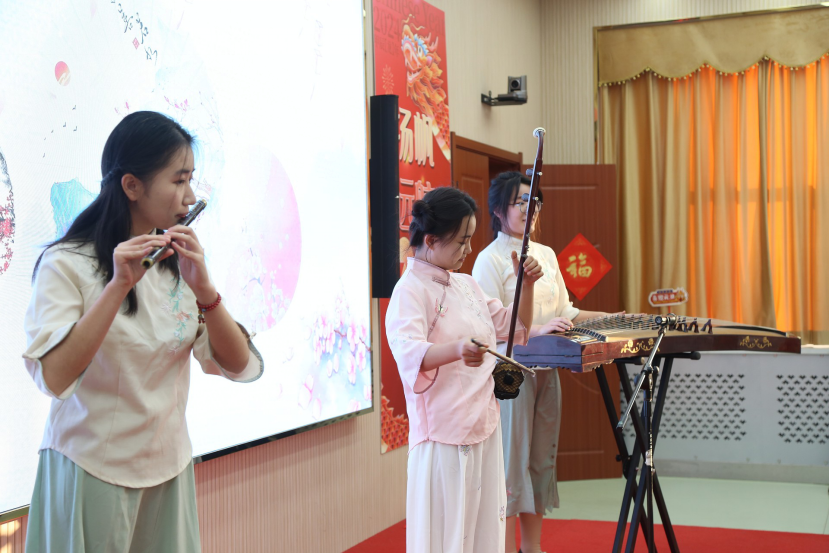 由学院师生共同精心准备,共同呈现了舞蹈《桃花朵朵开》、小合唱《光阴的故事》、民乐合奏《茉莉花》和歌曲《我爱你中国》等四个节目。师生互动、异彩纷呈,每个节目都获得了现场热烈的欢呼和持续不断的掌声。