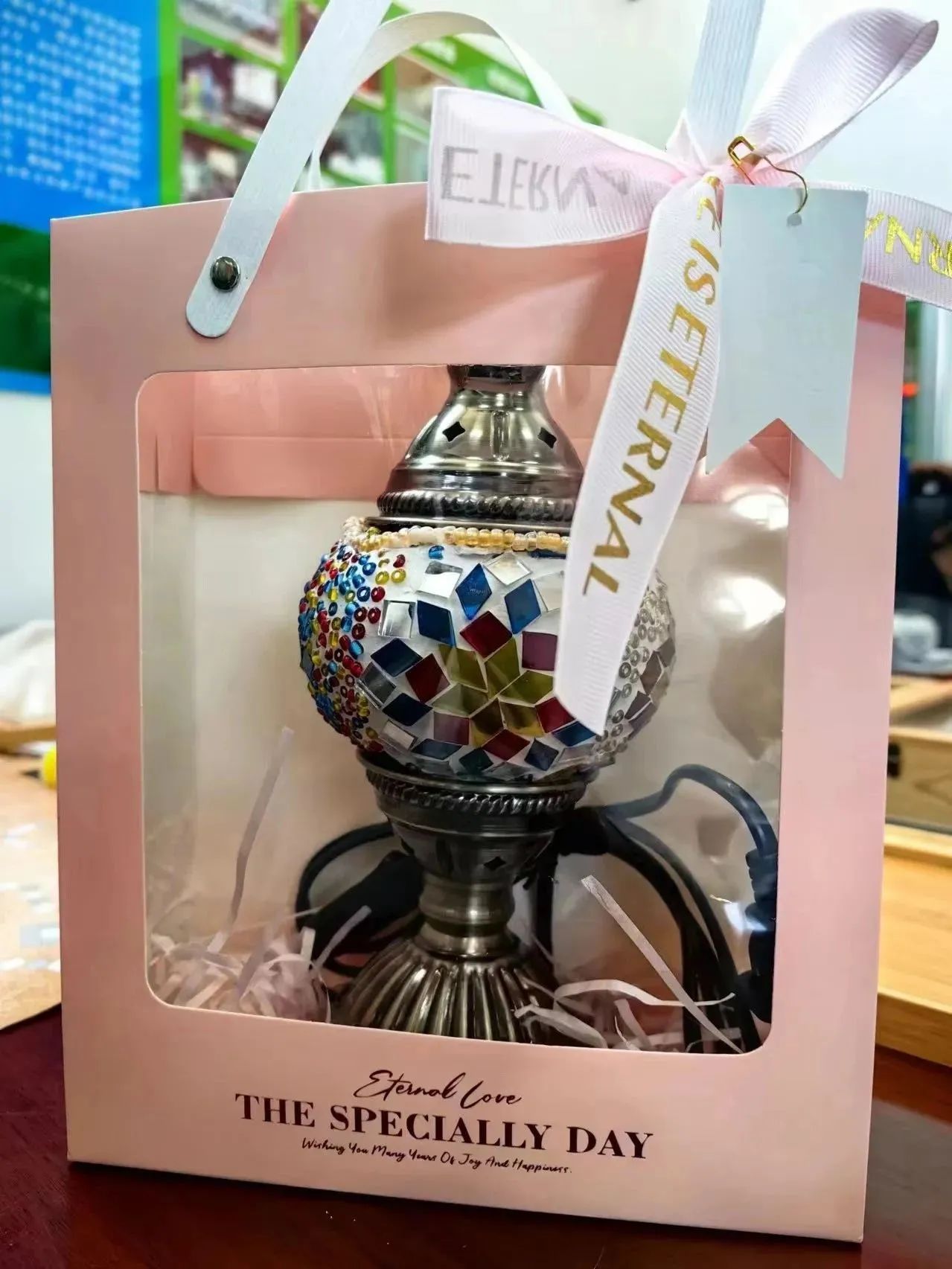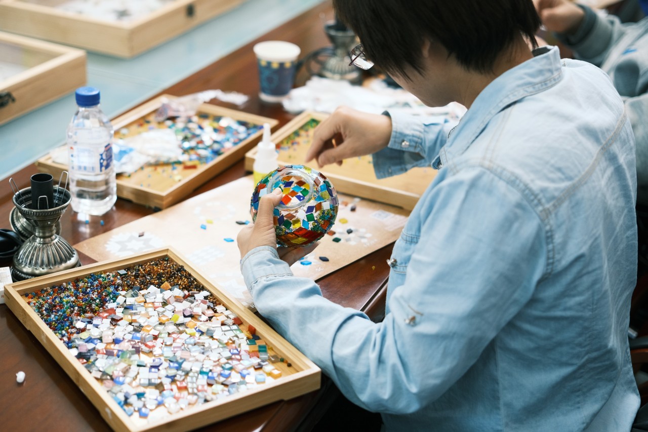 制作过程中,每名教师都充分发挥想象,感受不同马赛克贴片带来不同光影变化的惊喜,她们用灵动的手指将一颗颗细碎贴片拼凑成美好的图画,让原本纯净的灯罩展现出浪漫绚丽的光彩。