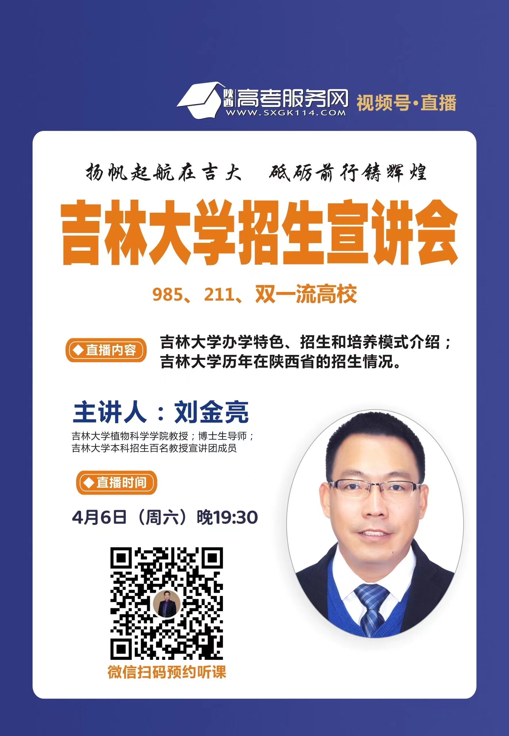 为持续深入开展陕西省招生宣传工作,提高生源质量,学院党委高度重视,通过陕西省高考服务网平台,在4月6日19:30组织开展了线上招生宣讲。吉林大学植物科学学院教授、吉林大学本科招生百名教授宣讲团成员刘金亮老师做宣讲报告,植物科学学院实践教学基地正高级工程师、吉林大学本科招生百名教授宣讲团成员唐明祥老师,植物科学学院机械工程教研室副教授姜长松老师,植物科学学院教学办主任温海娇老师在直播间现场为考生家长答疑。