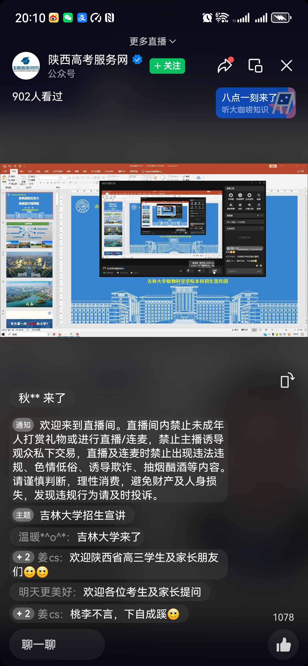 本次线上宣讲面向的是西安市2024届高三年级家长,宣讲会收看招生宣讲家长逐渐增加,人数最多达900余人。刘金亮教授介绍了吉林大学基本情况、优势专业、最新培养政策、大学生就业情况、在陕西省的招生情况等。唐明祥、姜长松、温海娇为考生答疑。通过本次线上招生宣讲,使西安市的考生家长更加了解吉林大学,相信会有更多优秀的学生报考吉林大学。