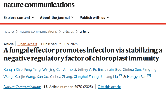 近日,吉林大学作物重大真菌病害成灾机制及其绿色防控关键技术研究吉林省创新团队在Nature Communications发表了题为“A fungal effector promotes infection via stabilizing a negative regulatory factor of chloroplast immunity”的研究论文,揭示了植物通过操控叶绿体蛋白稳态微调叶绿体光合-免疫平衡的策略,以及植物病原真菌通过分泌效应子稳定该蛋白来破坏光合-免疫状态转变的致病机制。