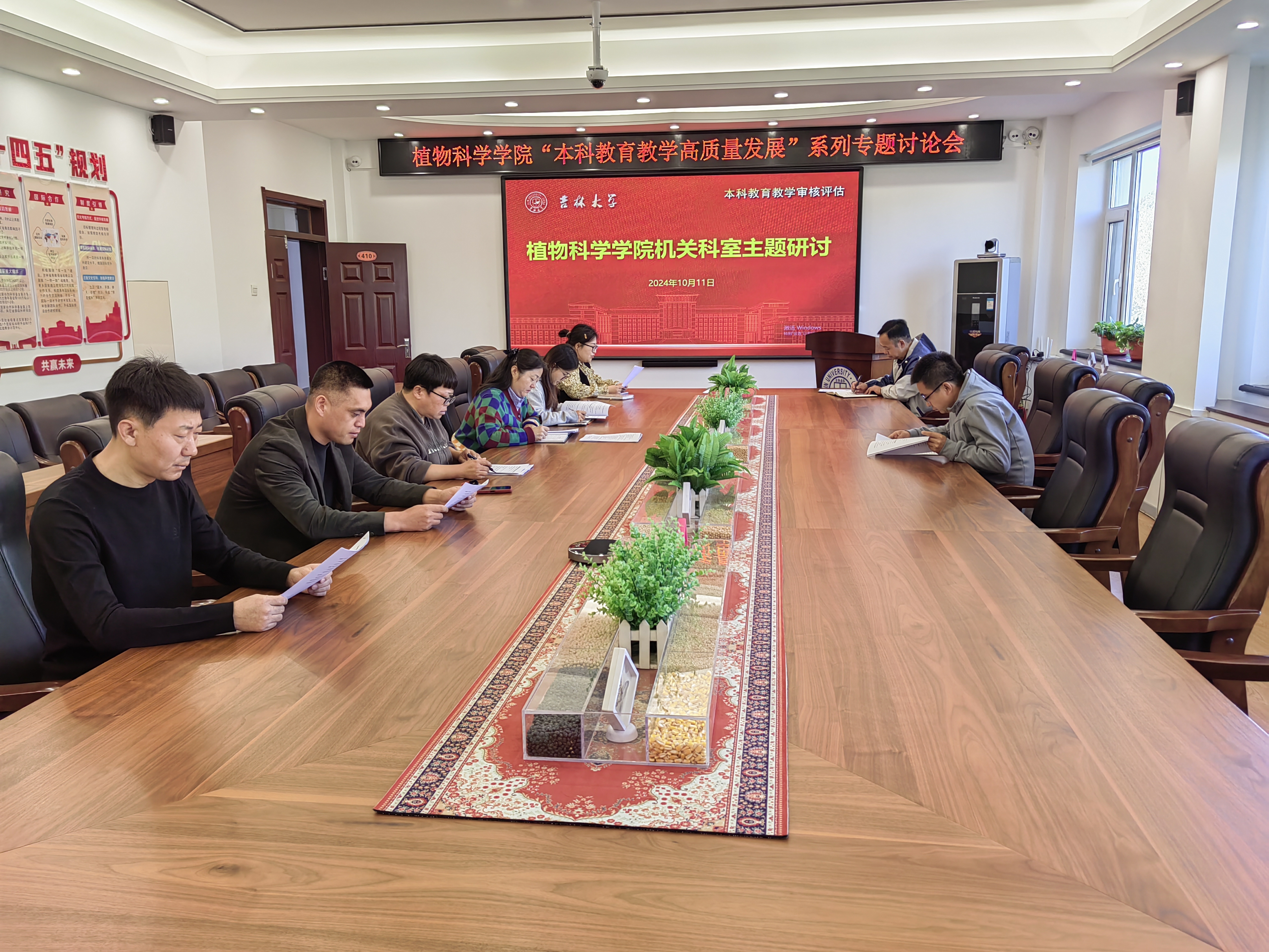 2024年10月11日上午,植物科学学院机关科室教工党支部召开党员大会,集体学习中共吉林大学第十五届委员会第四次全体会议精神,围绕行政管理人员如何促进和保障本科教育教学高质量发展进行研讨。机关科室教工党支部书记许琳莉主持会议,学院机关科室全体行政人员参加会议。