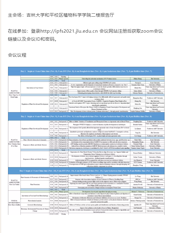 由吉林大学植物科学学院主办,Iwate University(日本岩手大学), University of Dhaka(孟加拉达卡大学),University of Saskatchewan(加拿大萨斯喀彻温大学),Dalhousie University(加拿大达尔豪斯大学),西北农林科技大学,福建农林大学共同承办的2021国际植物与食品科学青年学者在线论坛将于北京时间2021年11月8日-10日召开。大会将围绕作物科学创新研究,植物生长发育调控,植物生物与非生物逆境胁迫,植物保护,植物基因组、蛋白组、代谢组学,食品与环境科学研究等内容开展主题报告和讨论,届时将为大家呈现近40个精彩报告,欢迎广大师生踊跃参与。