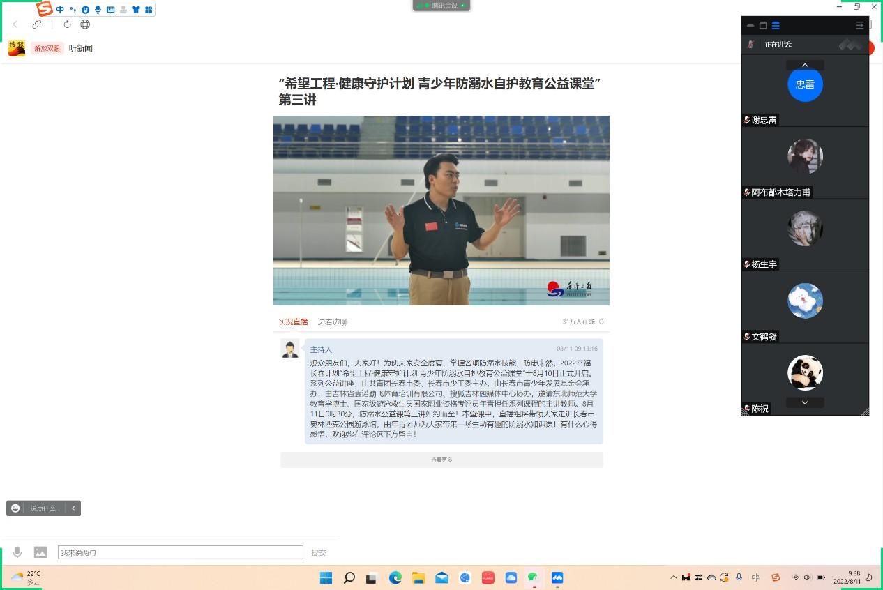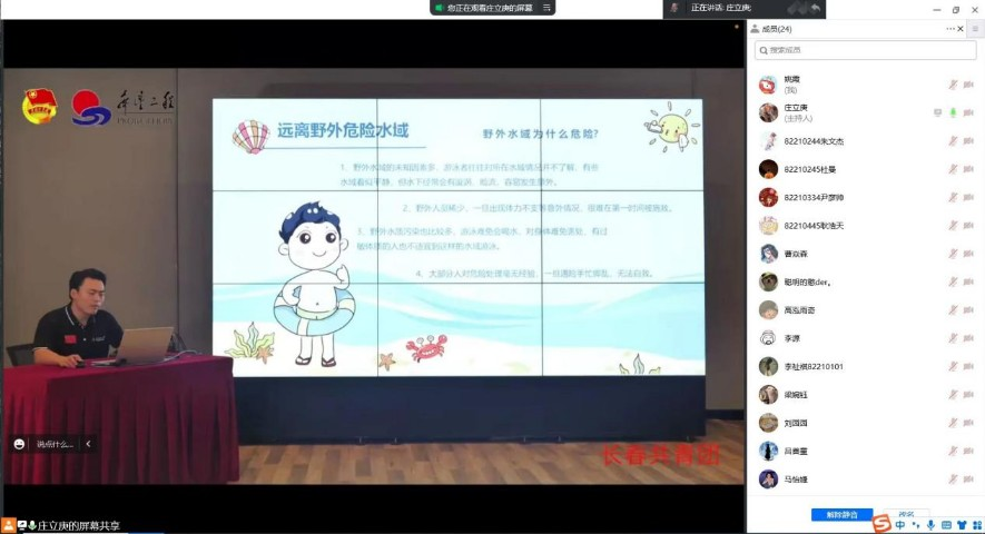 为积极响应团市委重视青年防溺水自护教育工作号召,创设更安全的学习生活环境,8月10日下午,植物科学学院团委组织学院全体团员于线上收看青少年防溺水自护教育公益课堂讲座,学习防溺水的重要性和生活中的一些基础急救知识,以增强学生应对突发情况的自救意识,更好地保障自己及身边人的生命安全。