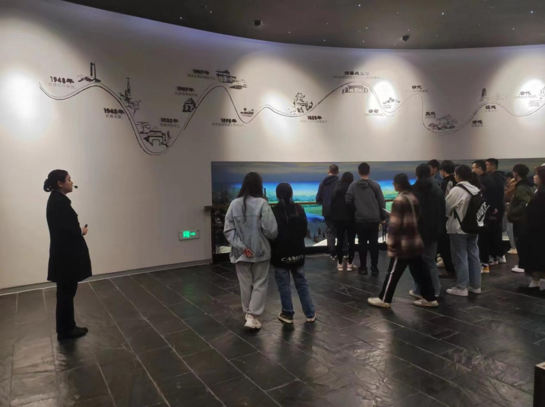 活动伊始,讲解员带领着同学们进入了规划馆一楼。首先是城市历史展区,展柜以古今最具代表性的商铺、企业和城市文化(世一堂、一汽、长影、雕塑)展现长春城市衍变的过程。